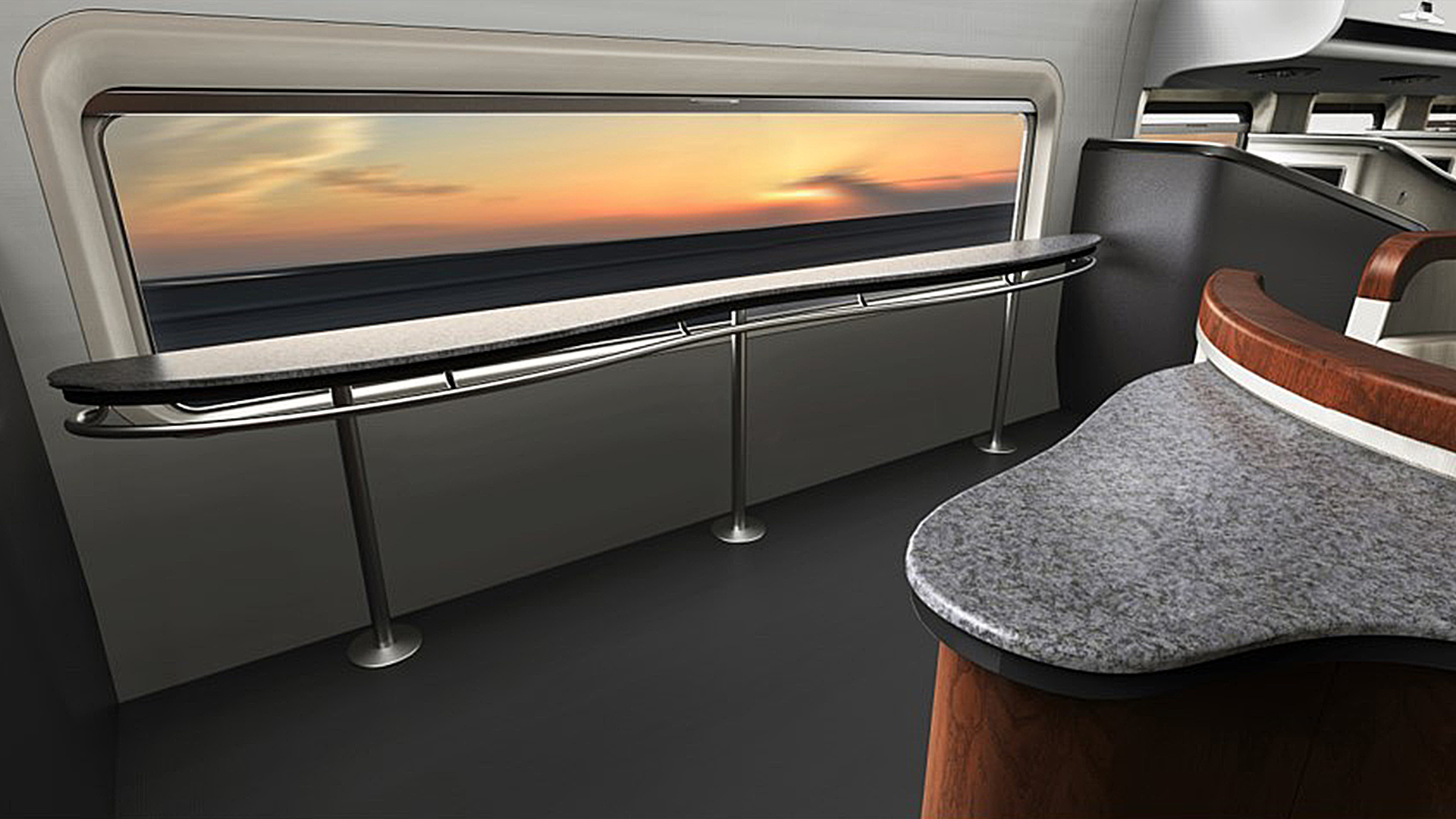 獨立的私人空間,科技感十足的乘坐休息區、全景觀景視窗、公共大空間會談區,成為該方案的設計特色。每個位置都有對應的大玻璃窗,可以方便的欣賞到窗外的景色,加之車廂內的燈光效果,渲染浪漫星空,讓每次出行氛圍都成為一種享受!