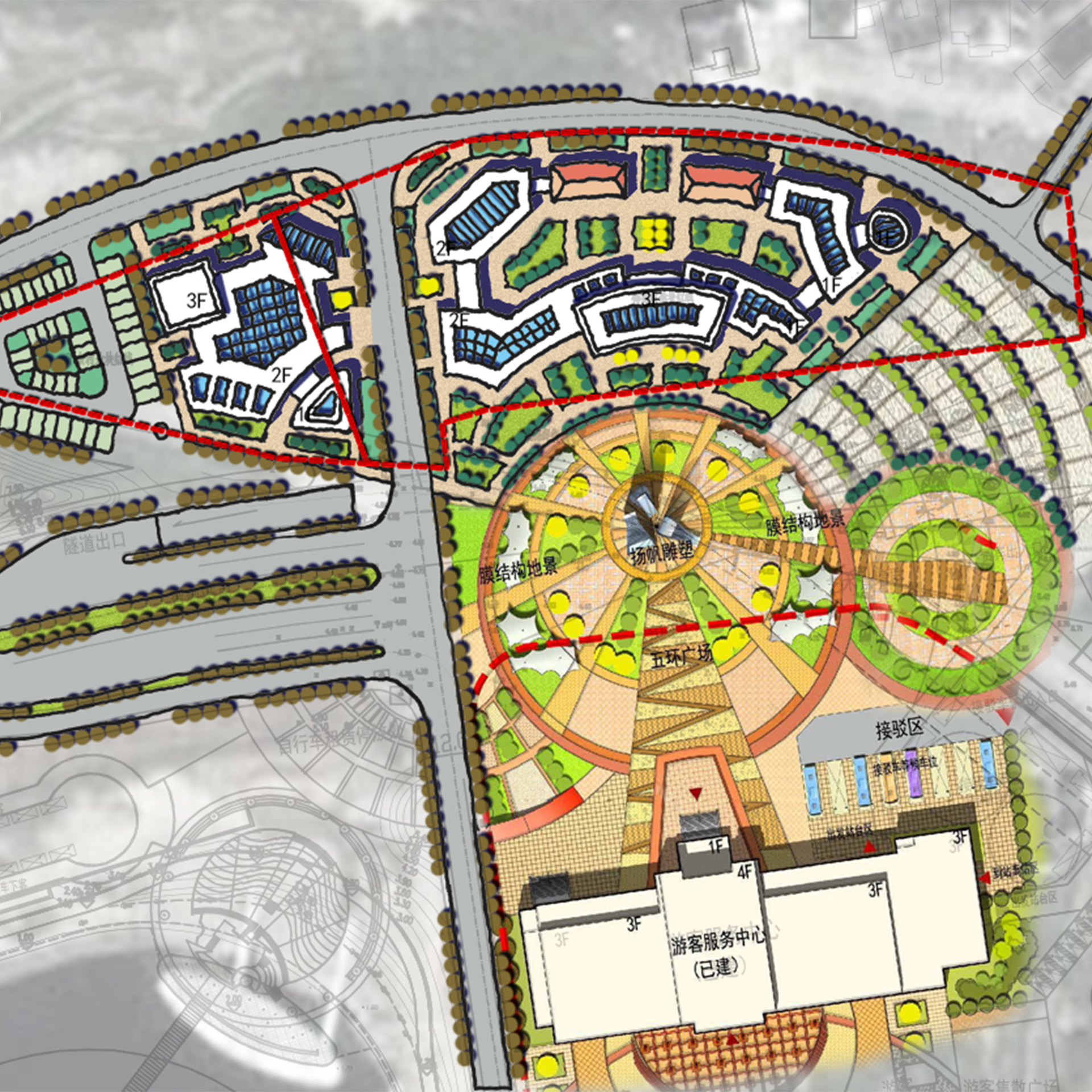 本案位于松蘭山海濱旅游度假區的人口位置。游客服務中心是景區的集散中心,為游客提供綜合型旅游接待服務。周邊配套建設生態停車場、換乘中心、旅游廁所等,內設有旅游咨詢點、購物商店、景區文化展示、醫療救護等游客服務項目。在滿足游客基本旅游需求的同時,利用游客中心內的展示區,介紹象山當地美食與文化以及相關文創產品等。