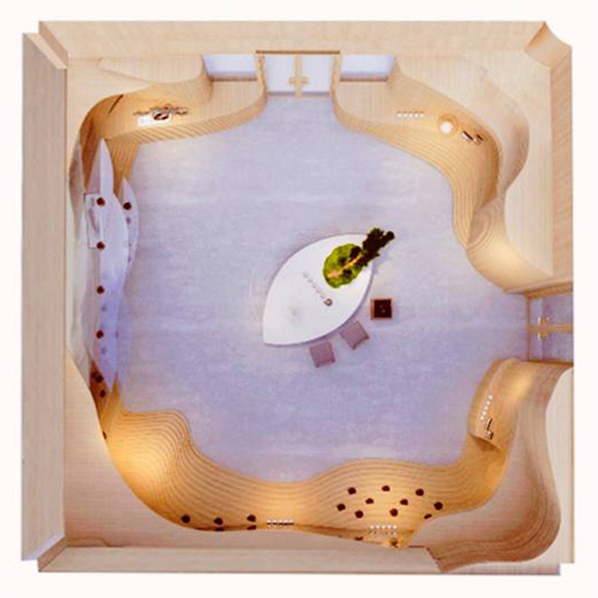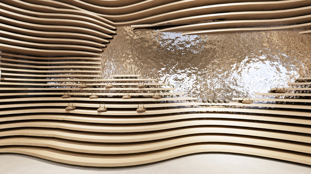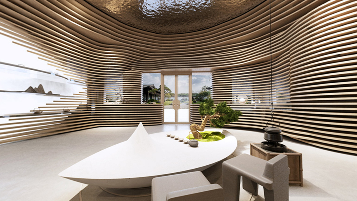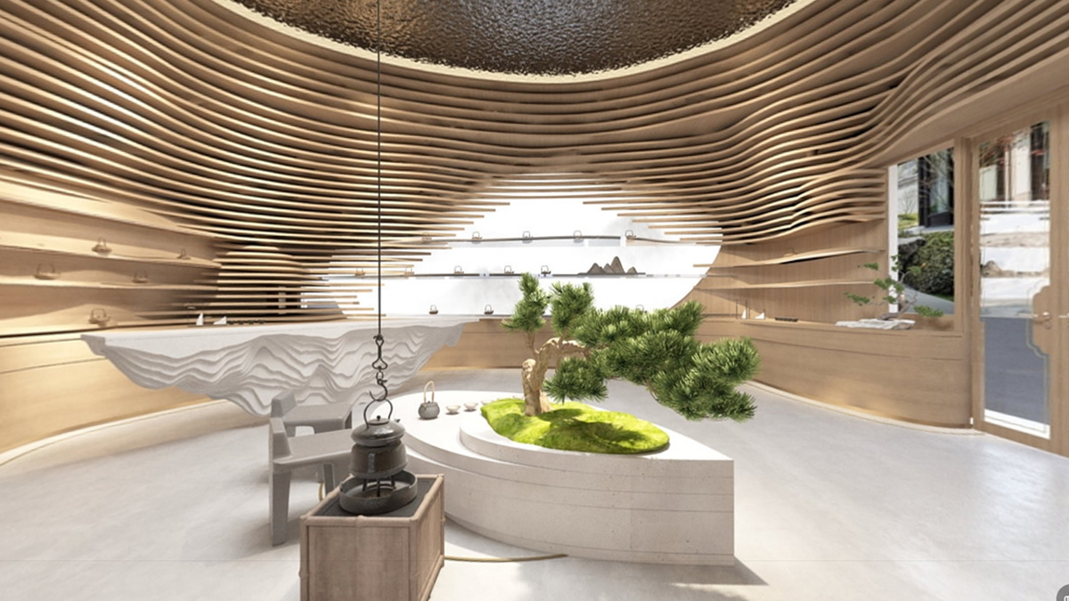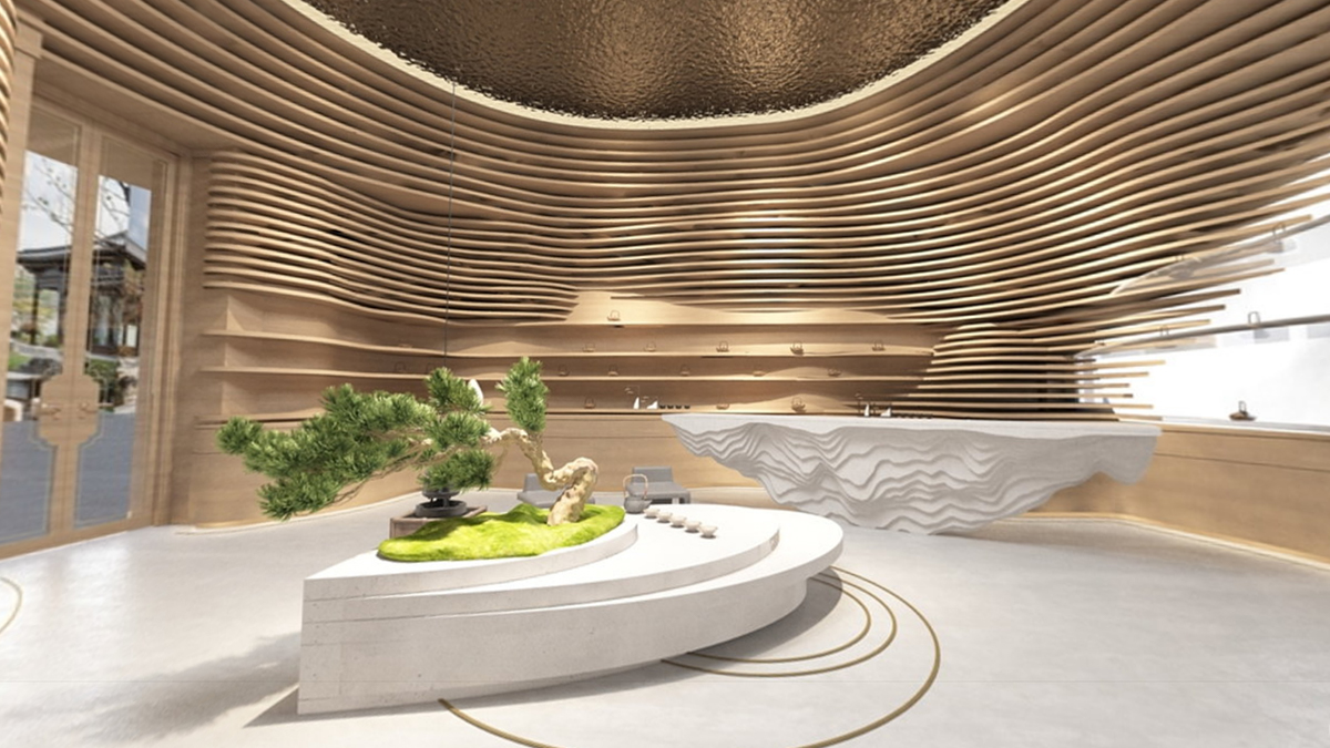 整體空間的靈感來自于自然地形——梯田, 所塑造的自然成型的層次。決定了人與動物行走,相遇,交談,互動的生態。茶葉本身也是從這個大自然采集而來,整體思路是希望空間能夠跳脫常規四四方方的死板規范,因為我們的世界是流動,曲面,不定性的。回歸自然,我們本該將自然界元素融會貫通,改變我們體驗商業跟人互動的形態,才能從底層反應茶這件事請的本質。