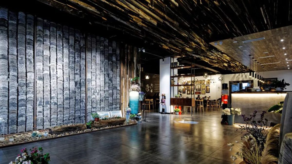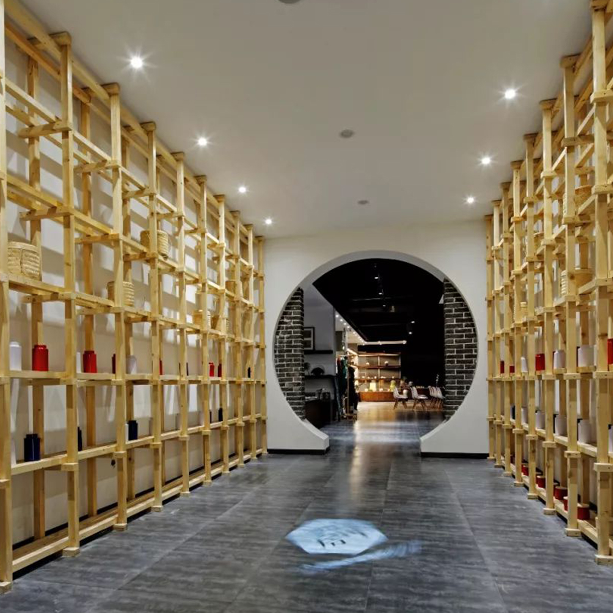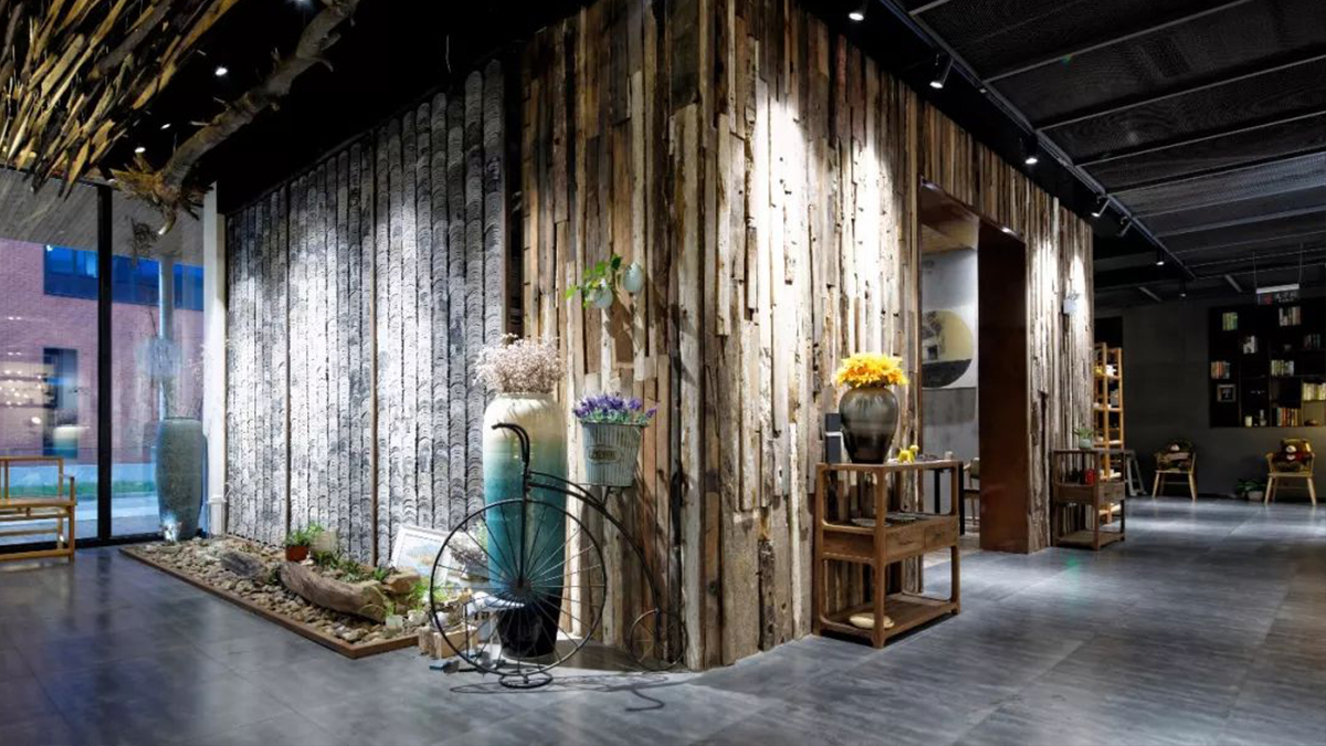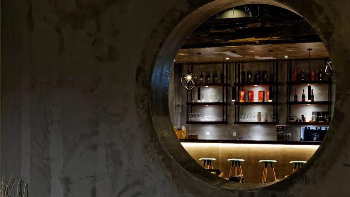 咖啡館空間利用了較多天然的材質(zhì)和簡單錯(cuò)落的形式,成就純粹的空間氛圍,使空間產(chǎn)生生長的自然張力。設(shè)計(jì)中不刻意追求材料的豪華和變化,著重幾種特定材質(zhì)的相互穿插運(yùn)用,以形成空間的有機(jī)和豐富。在虛實(shí)空間的處理上,運(yùn)用園林借景的手法,通過圓洞門構(gòu)成空間紐帶,使得整個(gè)空間虛實(shí)有序、渾然一體。