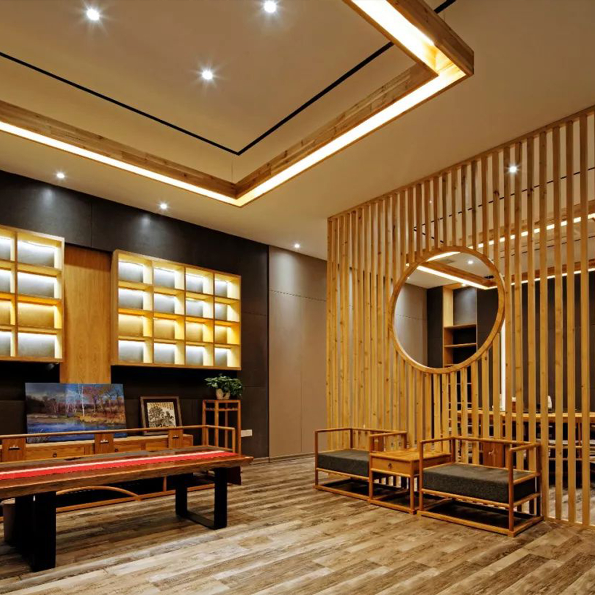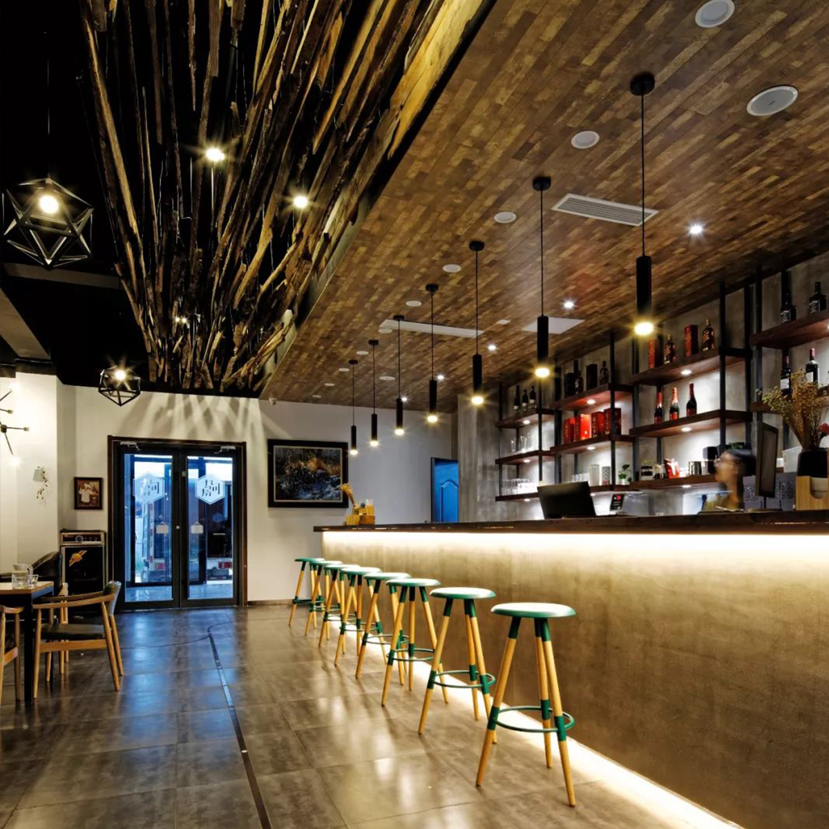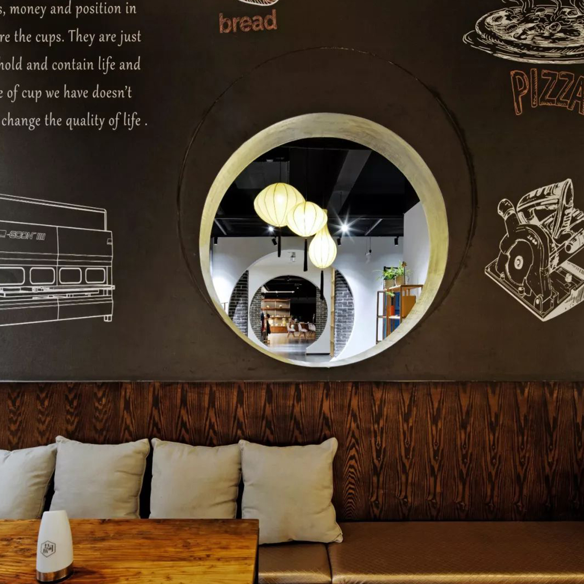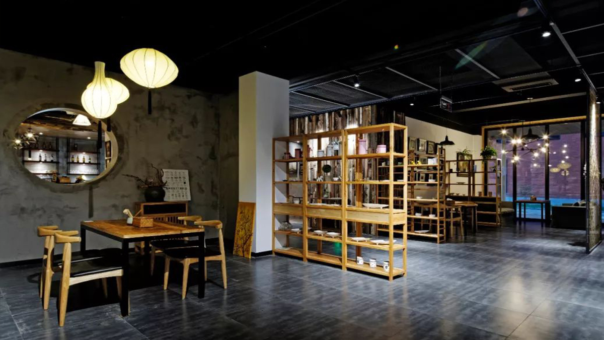 咖啡館空間利用了較多天然的材質(zhì)和簡單錯(cuò)落的形式,成就純粹的空間氛圍,使空間產(chǎn)生生長的自然張力。設(shè)計(jì)中不刻意追求材料的豪華和變化,著重幾種特定材質(zhì)的相互穿插運(yùn)用,以形成空間的有機(jī)和豐富。在虛實(shí)空間的處理上,運(yùn)用園林借景的手法,通過圓洞門構(gòu)成空間紐帶,使得整個(gè)空間虛實(shí)有序、渾然一體。