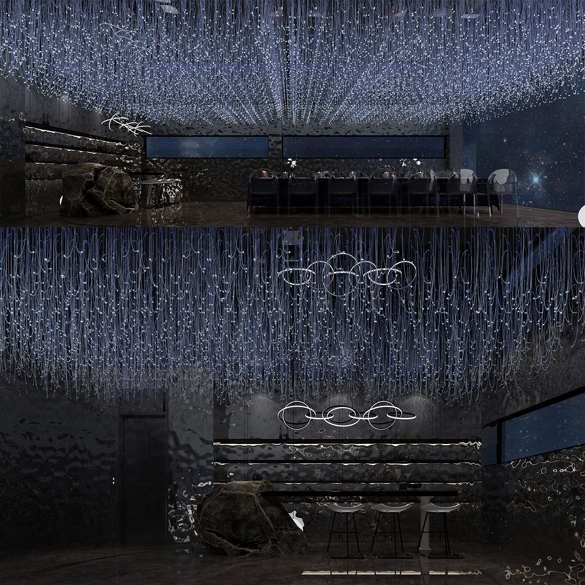 餐廳內垂掛起無數盞LED燈,用來營造一種夢幻星空的環境,星光熠熠,讓你感覺到仿佛置身于“星空”之中。