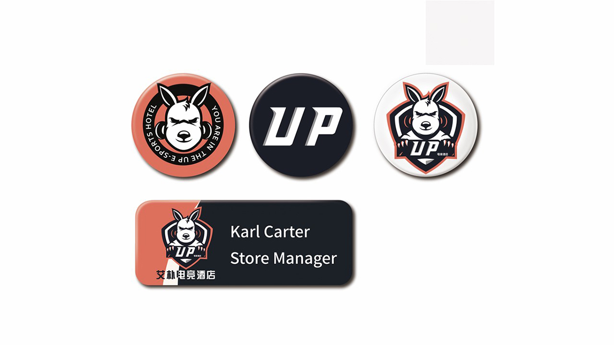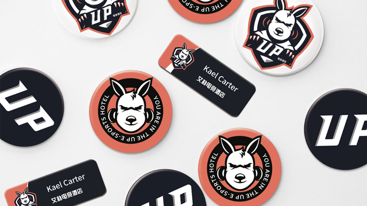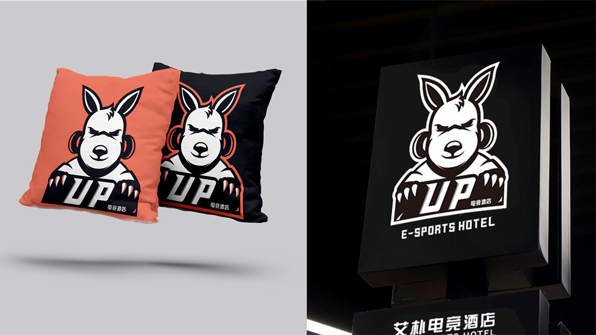 考慮到電競(jìng)酒店的屬性,在標(biāo)識(shí)設(shè)計(jì)上采用英文UP作圖文標(biāo)。袋鼠本身腿長(zhǎng)、有睡袋、只能向前奔跑,這些特點(diǎn)使得袋鼠寓意豐富。UP含有向上的、繁榮的意思,結(jié)合電競(jìng)團(tuán)隊(duì)合作、勇往直前、開拓進(jìn)取、不認(rèn)輸?shù)?游戲精神,以及酒店服務(wù)效率高,服務(wù)范圍廣的經(jīng)營(yíng)理念,因此在眾多動(dòng)物中選用了袋鼠作為代表形象,增強(qiáng)標(biāo)識(shí)識(shí)別度的同時(shí),也寓意著企業(yè)未來蒸蒸日上。